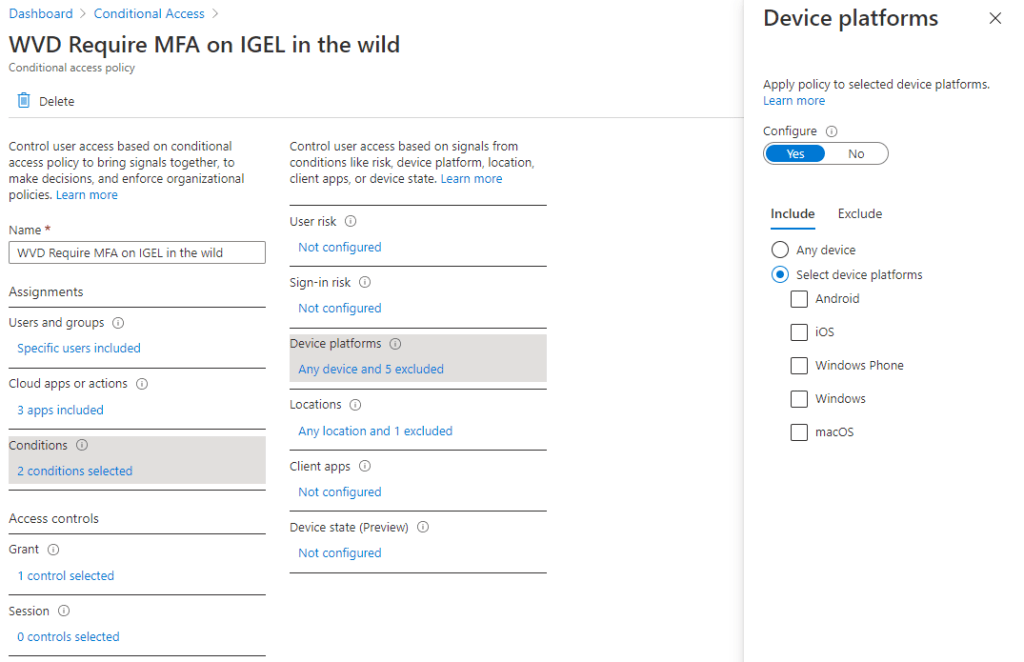 When you open up the ‘Conditional access’ and create a new policy, you specify the User or Groups to be hit by the policy, you specify which ‘cloud apps or actions’ and then go to conditions->device platforms you see that there is no IGEL OS there. Of course, if you select “Include->Any Device” in the config dialogue below, IGEL OS endpoints will be targeted, including your Windows or iOS or any other of the “known” operating systems. Sometimes you might want different rules hitting your iOS phones or tablets than your IGEL OS endpoints.