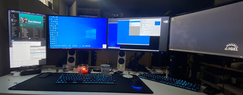 The above picture is of my main work desk. On the far left I have a vertical mounted Lenovo FullHD screen. The next 2 screens are also connected to my main endpoint and are two 27″ QHD. The screen on the right is my lab IGEL OS endpoint. Why this setup of choice? The vertical screen is ideal for browsers and app access. The next monitor is where I have my AVD session, which is my main IGEL corporate work environment. On the right monitor, this is my utility monitor where I connect to other resources, like my LAB, etc. On my far right, I have an IGEL OS endpoint connected to a regular 24″ FullHD monitor, allowing me to share experiences in remote meetings, more on that later.