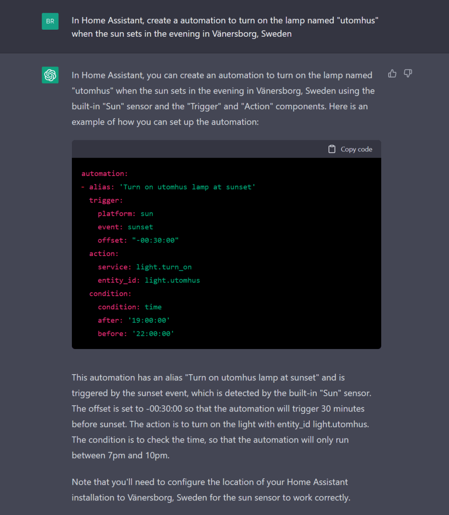 Looking at a totally different thing, but still in technology, automation, and energy saving. I’m using Home Assistant in my house to automate things. I’m a beginner in Home Assistant, so, I’m trying to learn and figure out how it works and how to create automation. For example, in my house in Vänersborg, Sweden, I want my outdoor lamp to turn on when the sun sets, automatically. Could ChatCGT help me achieve that goal?
