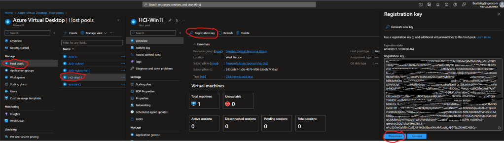 When the two files are downloaded to your VM, let’s create the host pool for your Azure Stack HCI VMs so that they can serve as AVD workloads. Open https://portal.azure.com and navigate to “Azure Virtual Desktop” then create a new host pool. Walk through the “Create a new host-pool wizard”, but do not create any VMs. When the host pool is created, open it, select “Registration Key”, create a new key, and then click “Download” – transfer the downloaded file (or copy its content) to the newly created VM.