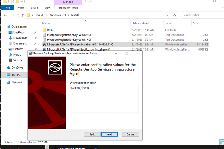 Then install the Microsoft.RDInfra.RDAgent.Installer-x64-VERSION.msi; when you get to the following screen, insert your token content in the text box replacing “INVALID_TOKEN”: