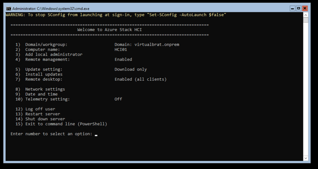 Use SConfig to set an IP address, subnet mask, and gateway. Set DNS Server, don’t forget to turn on “Remote Desktop” if you want to remote to the machine, and finally join the Azure Stack HCI host to your domain. Here is the Microsoft article describing SConfig maneuvering