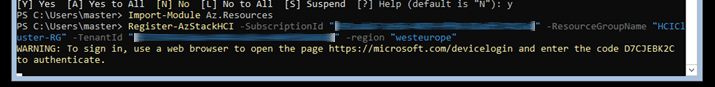 Register-AzStackHCI -SubscriptionId "3b9cada7-1e56-7940-99f8-83adfc7515ad" -ResourceGroupName "HCICluster-RG" -TenantId "7c129784-8aba-d444-ed3a-e04ef18a688c" -region "westeurope"