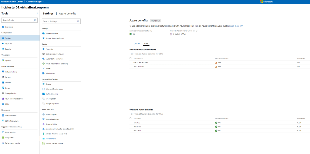 The final piece of configuring the Azure Stack HCI Cluster is to enable Azure benefits – this is the magic of being able to run Multi Session Windows 10 and Windows 11 VMs on-prem! Let’s get it done! Navigate to “Cluster Manager” in Windows Admin Center, and your cluster, click on settings in the left menu pane, scroll down to “Azure Benefits” and enable for your cluster. It should look something like this when done:
