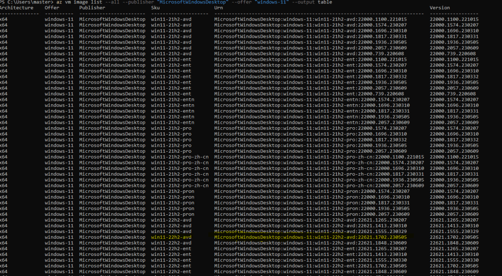 az vm image list --all --publisher "MicrosoftWindowsDesktop" --offer "windows-11" --output table