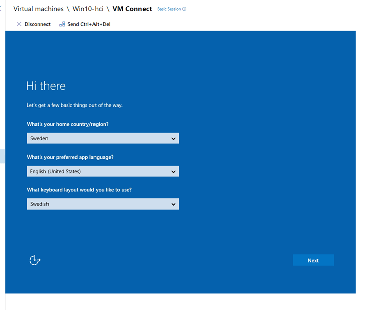 That should be it! You should now be able to power on your first VM in your Azure Stack HCI cluster! When you do so, you can go back to the VM overview by clicking “Virtual Machines” in the left menu pane, select your newly created VM, Click “Power->Start” and then click “Connect->Connect”, and you should be presented with this, eg the OOBE wizard: