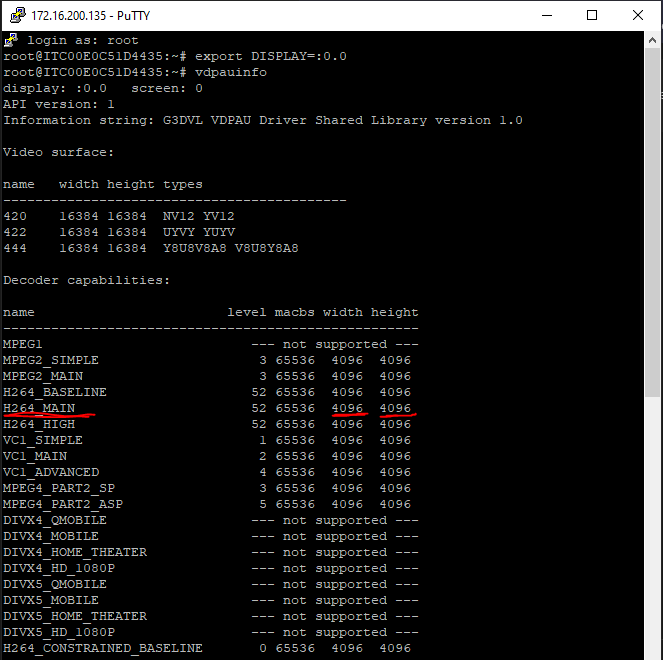 Using PuTTY i remotely connected to the UD7 and issued the command vdpauinfo, which will give me some info on what the device can do in terms of h264 hardware decoding etc. The result of the command is here: