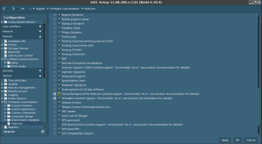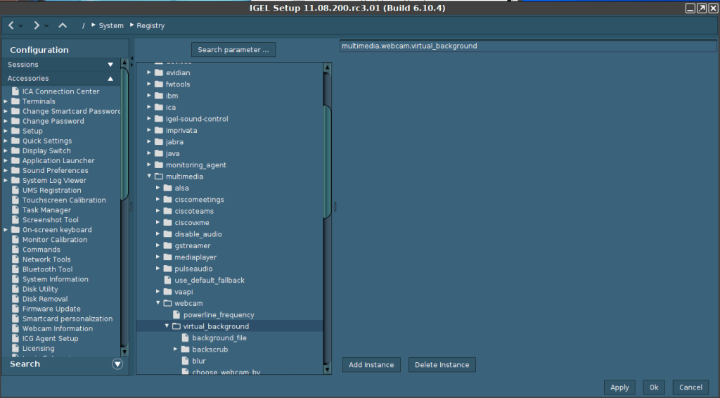 If you want to use the Universal Virtual Webcam feature, simply just enable the feature (IGEL Setup->System->Firmware Customization->Features->Virtual Background for Webcam) and then configure your settings in IGEL Setup->System->Registry->multimedia->virtual_background