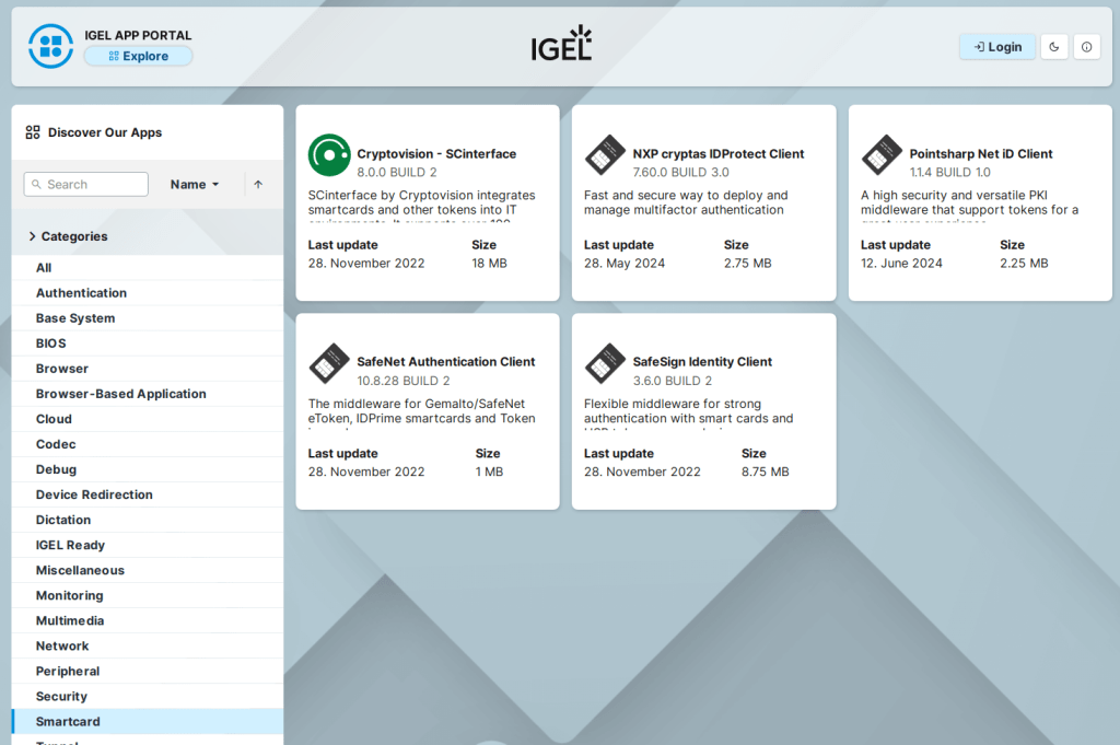 When Entra is configured, the second part will be to add the smart card middleware to your IGEL OS endpoint. IGEL OS 12 includes OpenSC as middleware, but it needs to be enabled in the IGEL Setup registry to be active, or you can install any of the available middleware’s in the IGEL App Portal: